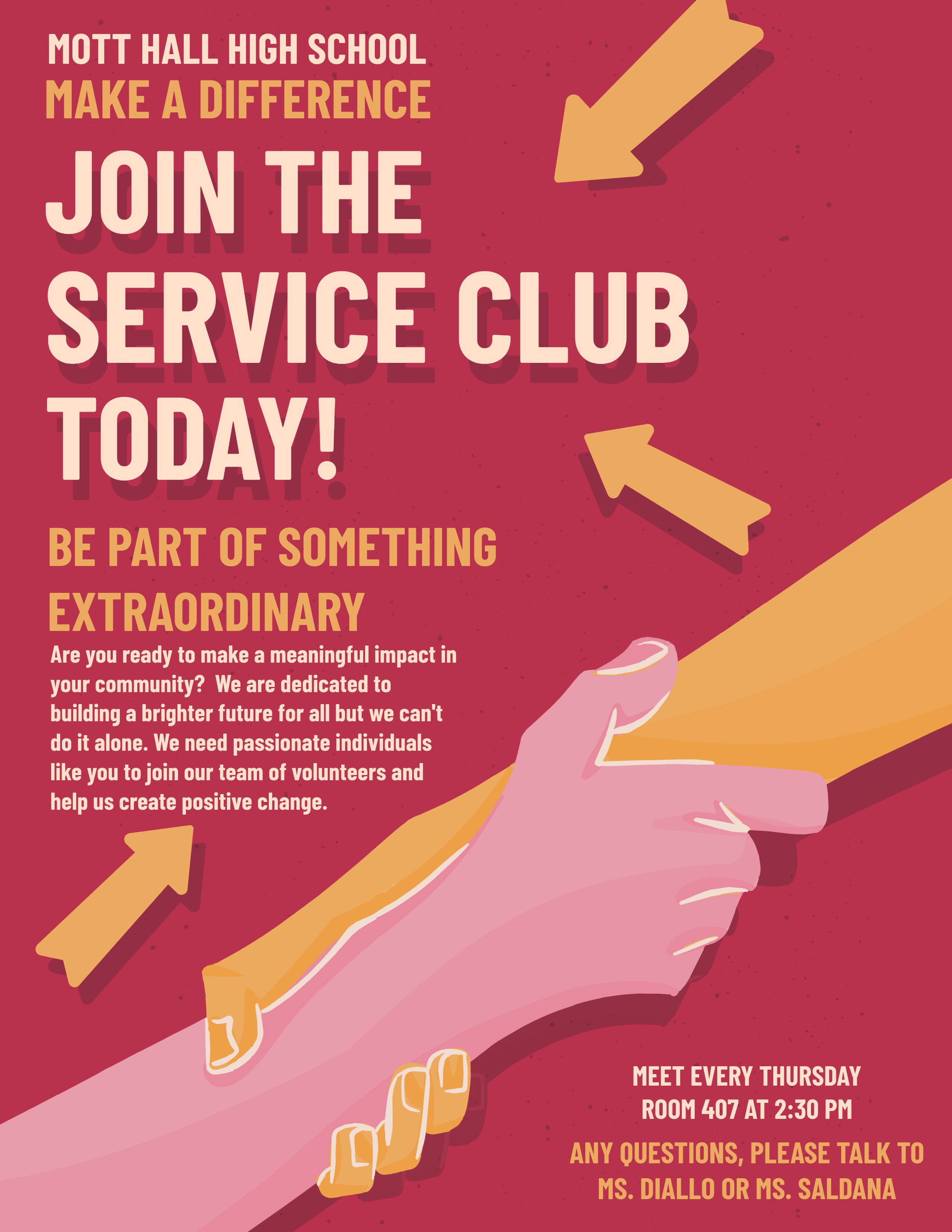 Service Club is for students that want to make a difference in their community. Students will be working closely with Ms. Diallo and Ms. Saldana to help assist school events, outside organizations, volunteer for events in the local community. As community is one our core values, we hope a lot of students consider Service Club as a way to help those who may not be able to help themselves or build new relationships with people they may have never met.